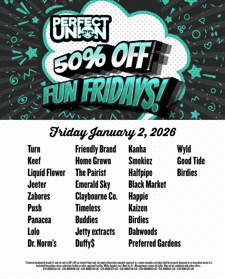 Click here to sign up for our Perfect Union Discord channel to receive push notifications and messages about sales, brand in-store events, pop-up promotions, fresh drops and exclusive cannabis community conversations with growers and brands.